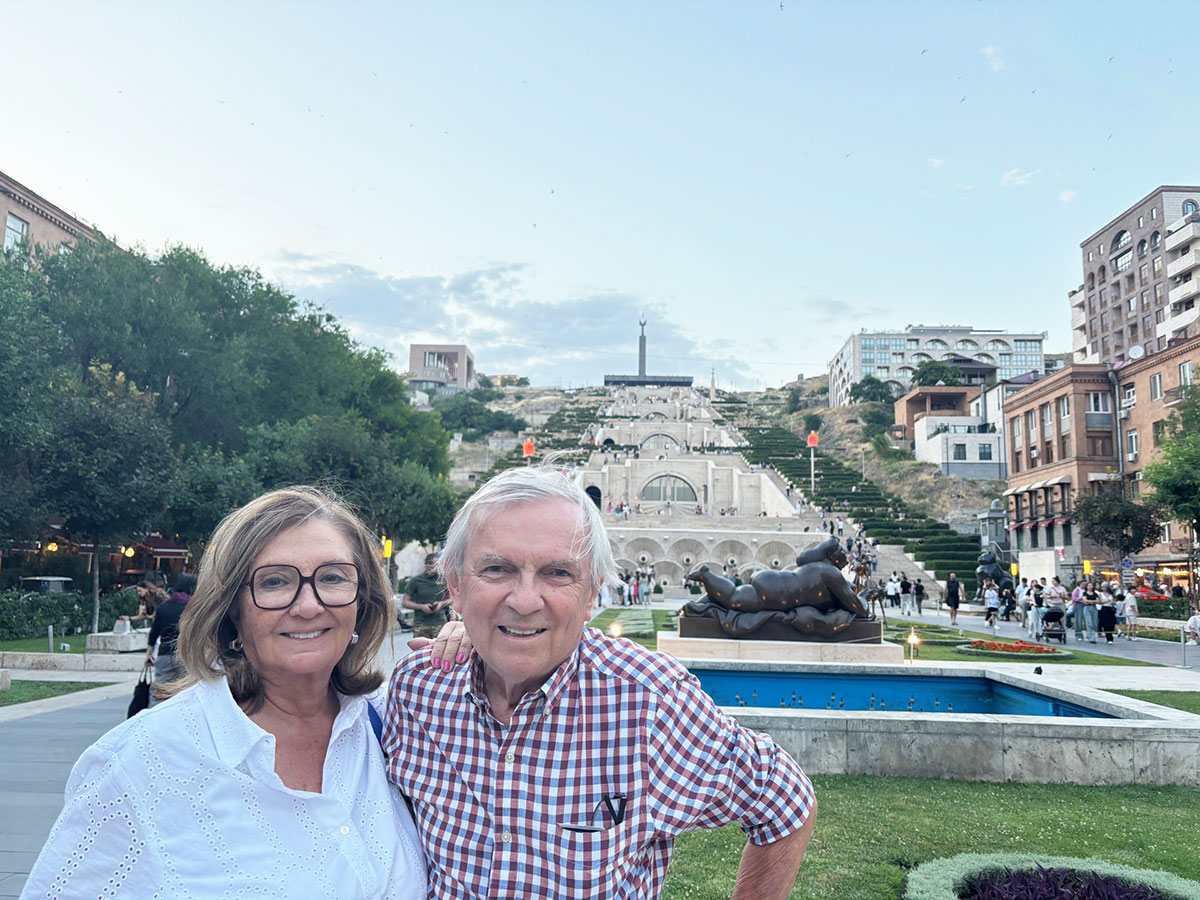 ![]() We started our visit in Yerevan, the capital. Full of street cafes and restaurants, a very lively city. This is a large staircase, waterfall monument in the center of Yerevan, with a Botero statue just behind us. Almost everyone we met speaks English. Click on any photo to see a larger image. |