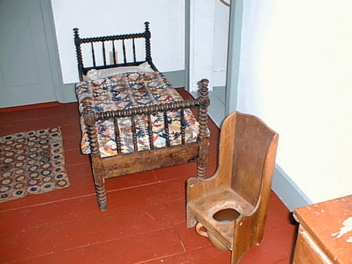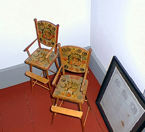 ![]() Child's bed and several middle to late 19th century toys, dolls' high chairs. The nursery is just outside the master bedroom. |