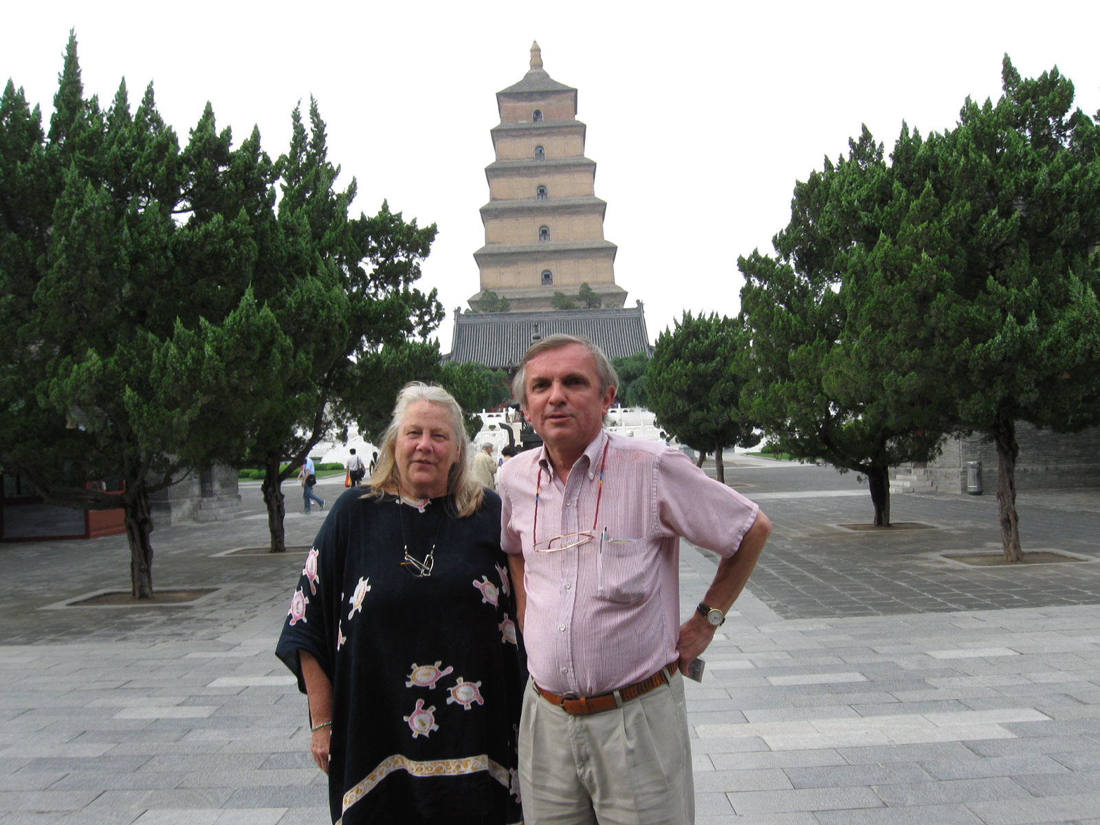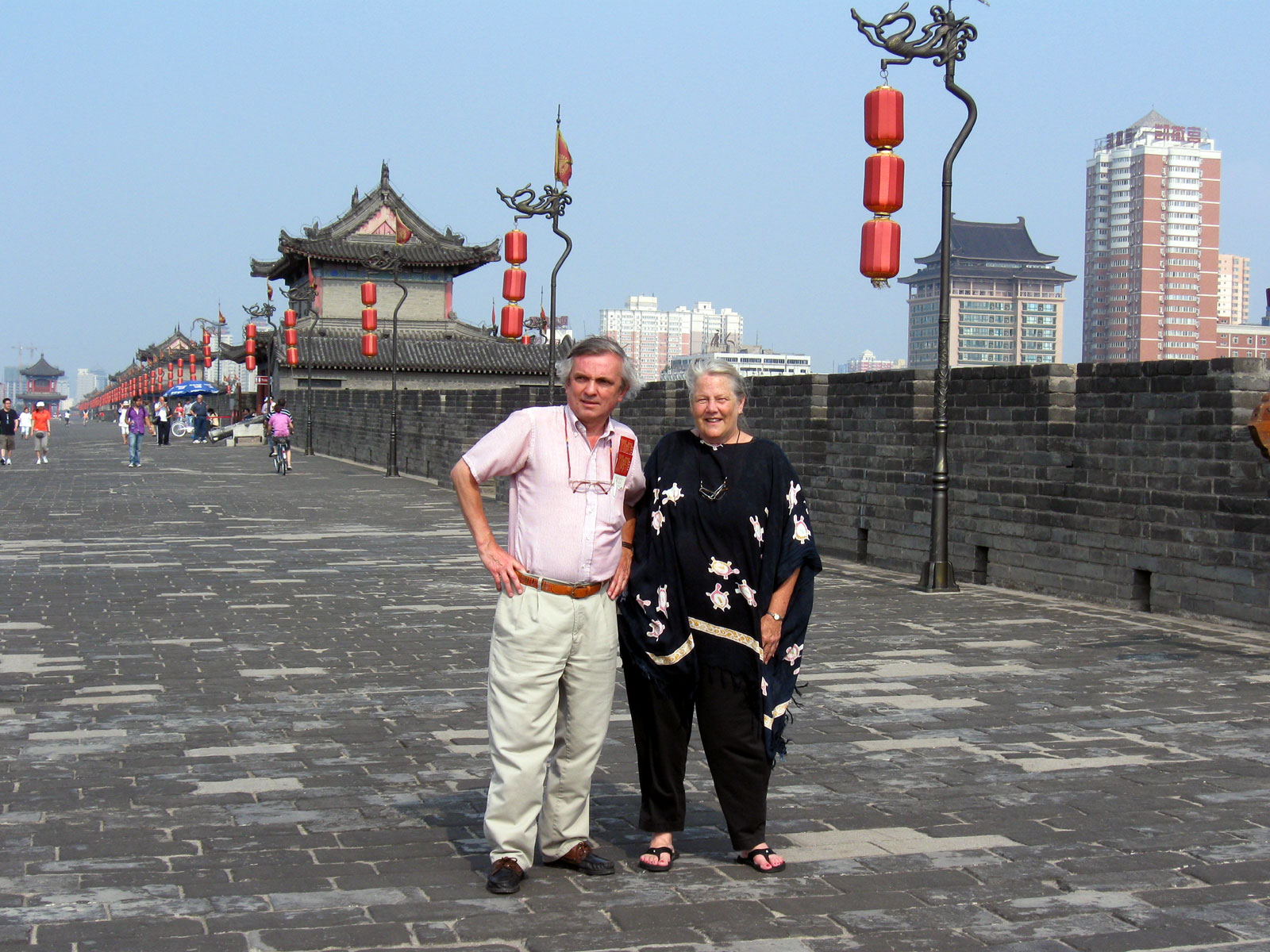 X'ian had a million people in the 9th century, possibly the largest and wealthiest city in the world at that time, at the eastern terminus of the Silk Road. Today, it has 7 million. But it still has its city walls intact, 13 kilometers long. Here we are on top of the city wall near the South Gate. Click to see a large image. |