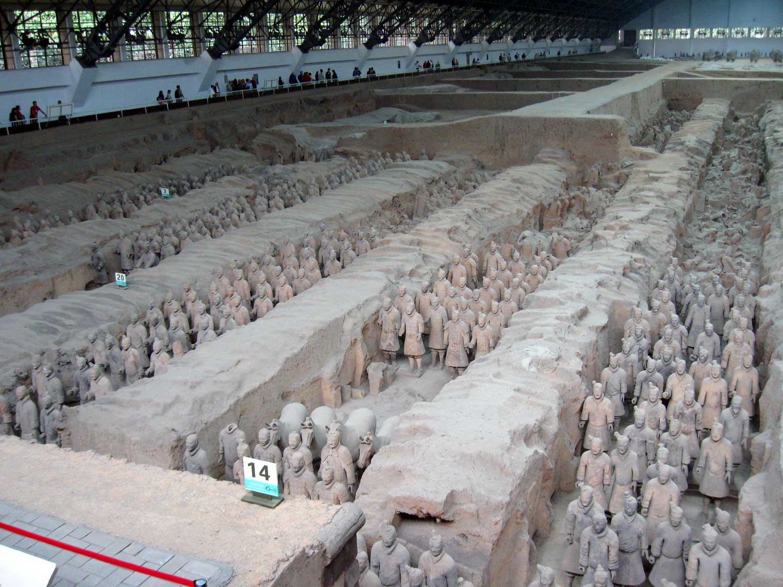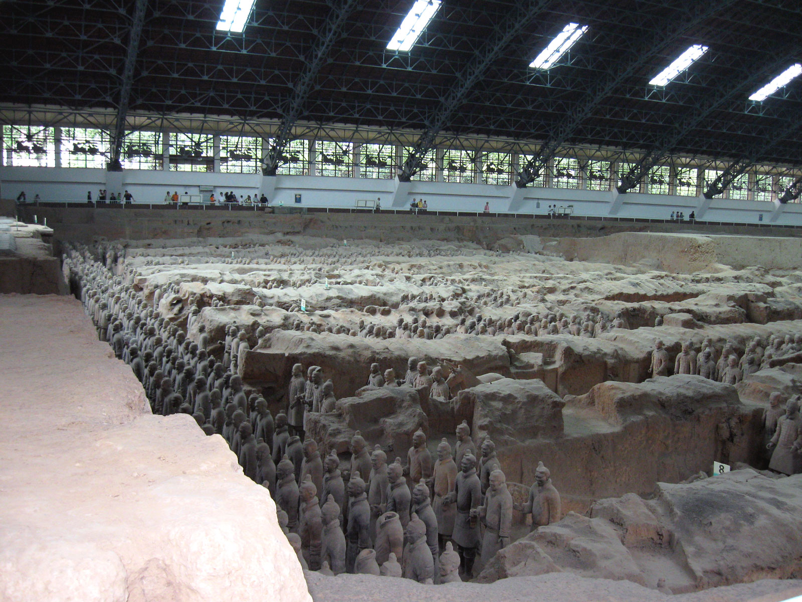 ![]() X'ian terracotta soldiers were found in 1974 by Mr. Yong, who was digging a well. There are some 6,000 soldiers in "Pit 1", guarding the "First Emperor" and more in "Pit 2" and "Pit 3". All of them are as tall as a tall man ... for a sense of scale, please note that there are people walking on the walkway above! Click for a large image. |
