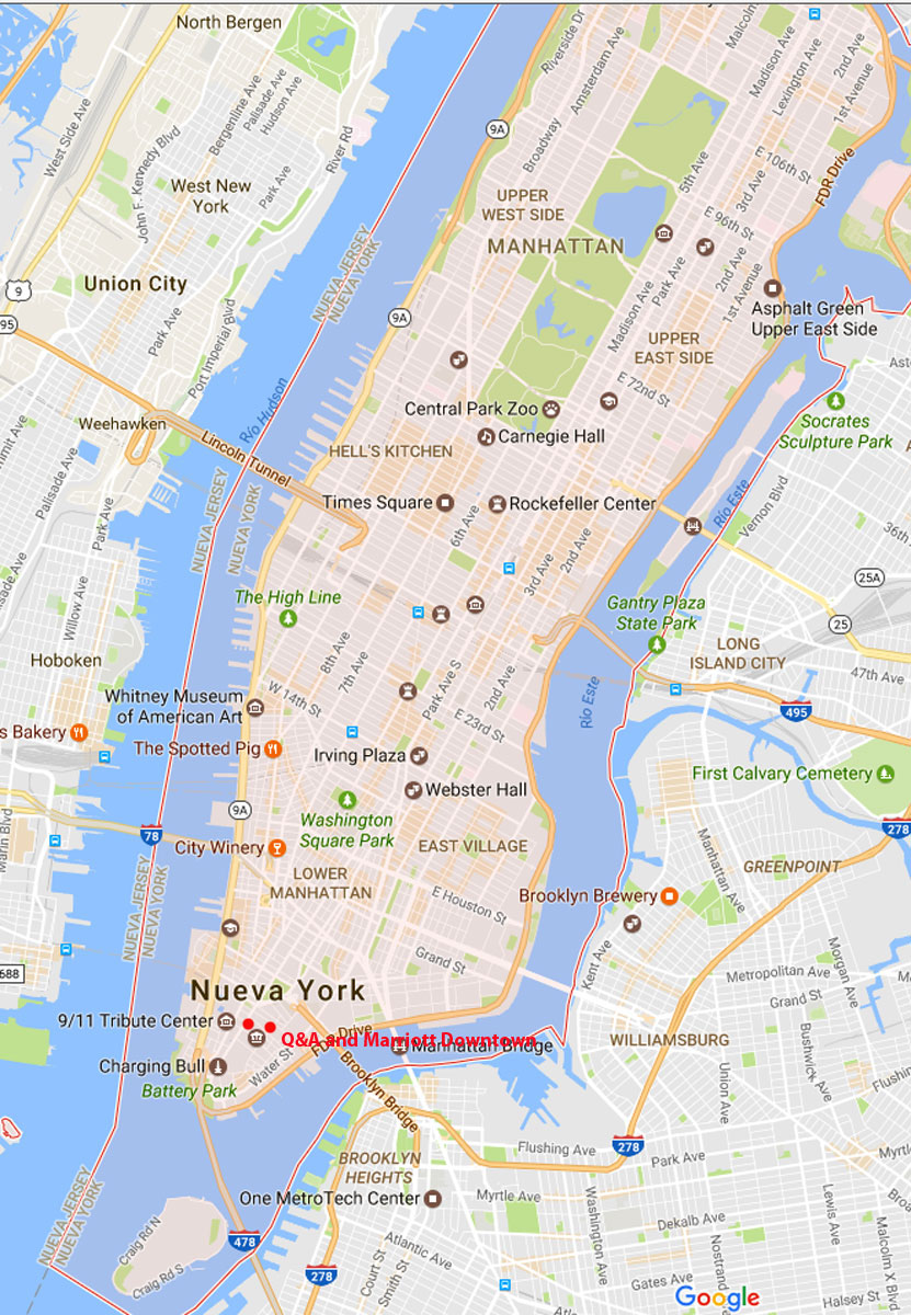 New York. I think everyone has booked their digs, but for the record, I include the Q&A Residential Hotel details at the bottom. Quite a lot of our activities, from the opening day and on will be in and around lower Manhatan, which is now an exciting place to be. I lived there for 20 years. In the past few years, with Lorraine, we stop by once or twice a year. There are plenty of all night supermarkets and delis to get supplies for your kitchen. Click on the image on the right to see a larger map. |