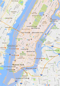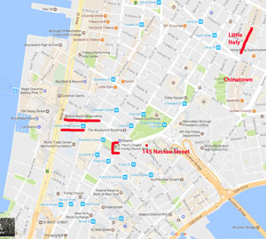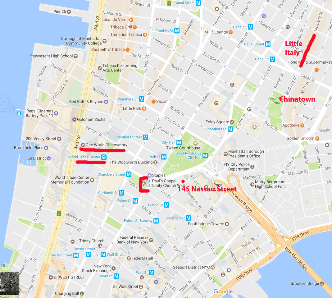 Thursday, October 5: Vince & Stephanie suggested we visit the Botanical Garden ( https://www.nybg.org/), with a Dale Chihuly exhibition of breathtaking glass exhibits. We will set up a time during our Monday meeting. "Time Out" recommends this as the best exhibition in New York now. 5:30 p.m. Meet us at 145 Nassau Street, apartment 3C for a glass of wine. This will be another walking evening, a short walk past City Hall, the Municipal Building, Police Plaza (and the jail where our ex president Alfonso Portillo spent a lot of time, (now home to Chapo Guzman), to Chinatown for dinner. Then, across the border (Canal Street) from China to Italy. Ice cream and espresso in Little Italy, Caffe Palermo: "The best cannoli on Planet Earth". Click on the image on the right to see a larger map. |