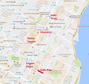 India" on Murray Hill. After shopping, we will walk to Gramercy Park and Union Square, stopping for coffee or drinkies along the way. For those willing to keep walking, we'll go past Cooper Union Square to "India Row", East 6th Street, between 2nd and 1st Avenues. If you don't feel like walking, you can take a taxi or UBER. But it should be a lovely afternoon's walk. As in London, we start our exploration of New York curry at the bottom end of the Indian food chain in Manhattan, moving up to the top on Friday. 7 p.m. ... Raj Mahal, at 322 East 6th Street. India Row has declined ... rents are shooting up and restaurant leases are being cancelled. Even Raj will close in a couple of years. We visited with Lorraine on May 13 and picked the Raj Mahal. Good food, recommended by people we met at the restaurant. We ate there a good lunch with friends couple of years ago. They have live sitar music. Click on the image on the right to see a larger map. |